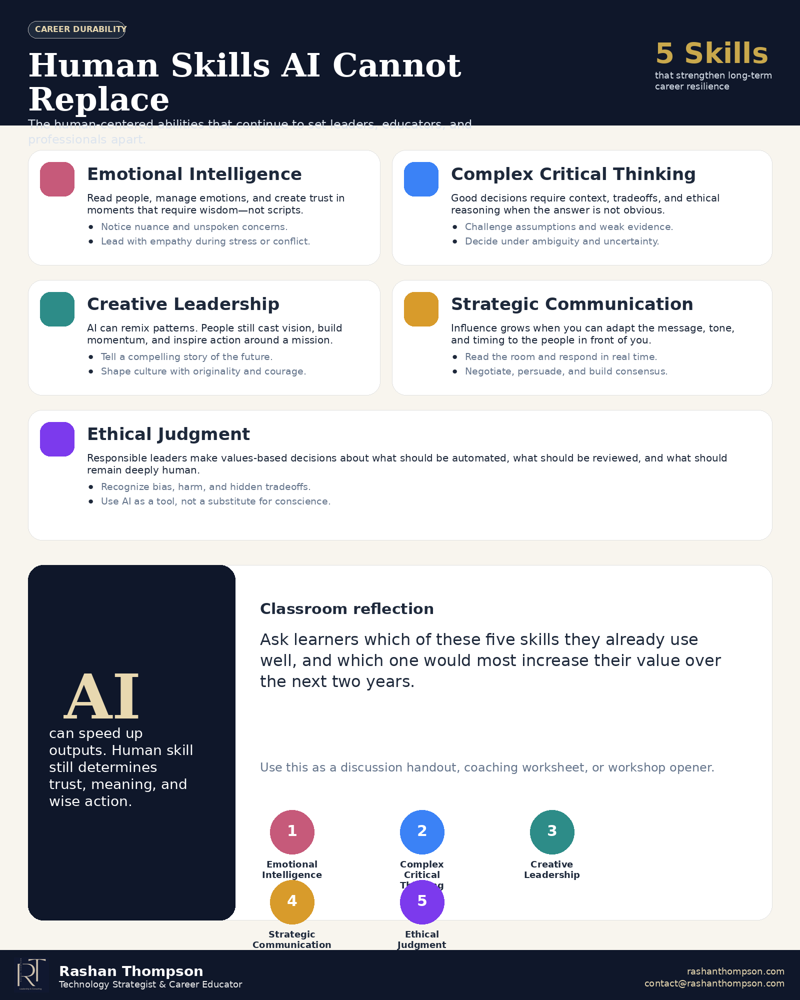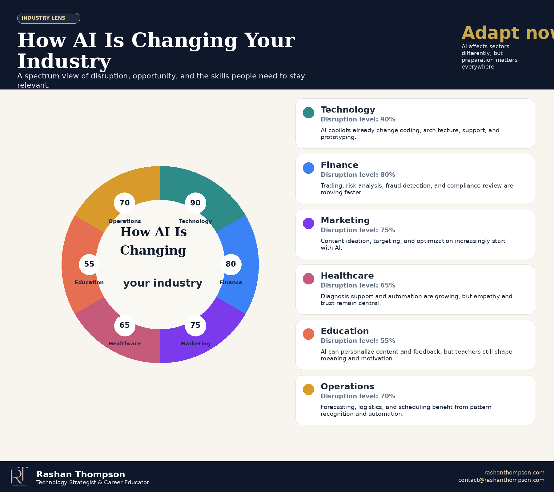 A 5-question snapshot of your AI readiness across tools experience, automation awareness, learning agility, and career resilience.