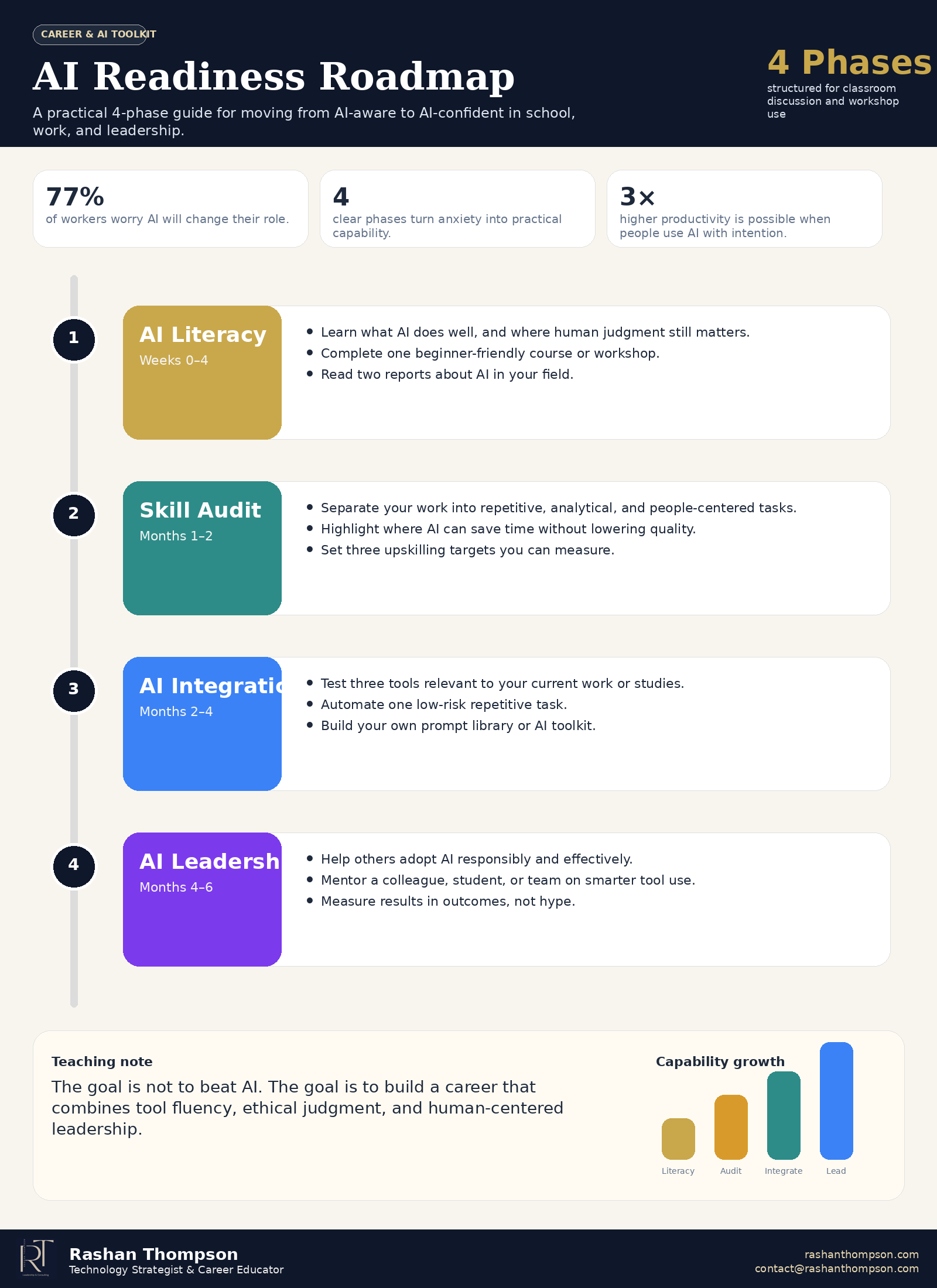 A 5-question snapshot of your AI readiness across tools experience, automation awareness, learning agility, and career resilience.
